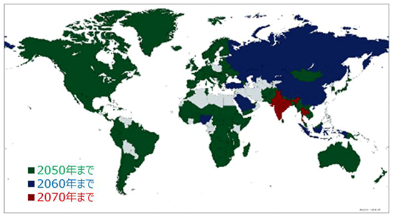 これらの取り組みにより、海外各国は2050~2070年頃のカーボンニュートラル達成を目指しています。